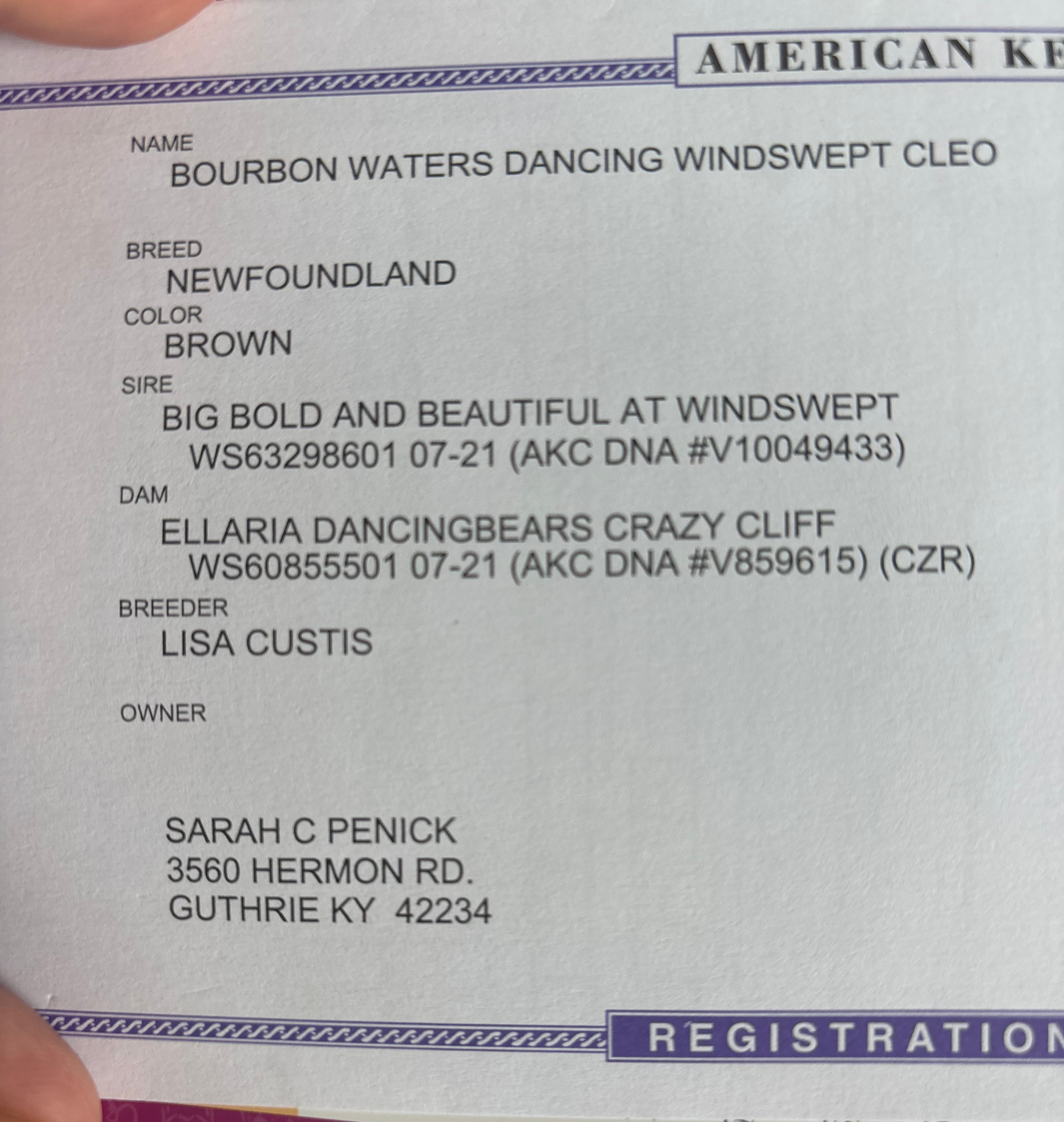 Isn't she a beauty! This cutie pie was a first time this July! She has been a good momma, but is still young and playful at heart. We would see her playing with her puppies and trying to get them to run with her down in their room of the puppy barn. She has the best hips on the farm actually and she is one of the more athletic Newfies we have ever had. She is eager to please, and doesnt really like to get too far away from us when we let her out on a run. She will be 3 in January. She also had DNA testing and you can see it, just ask! It is also normal.